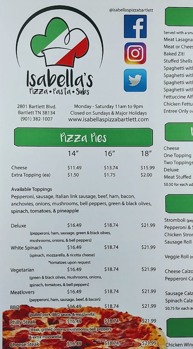 Welcome to Isabella's Pizza, a hidden gem located in Bartlett, TN, that brings the authentic taste of Italian cuisine to your table. The menu is a delightful array of options, showcasing their signature pizza bowls with customizable toppings—perfect for both meat lovers and veggie enthusiasts. Try the Deluxe Bowl, a crustless wonder packed with pepperoni, sausage, and a medley of vegetables, all lavishly covered in three types of cheese.